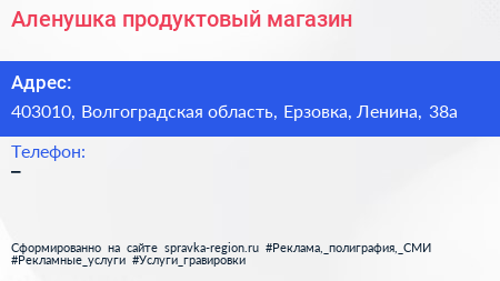 Аленушка, продуктовый магазин по адресу 403010, Волгоградская область, Ерзовка, Ленина, 38а в дальнейшем Организация, размещена в следующих категориях:
