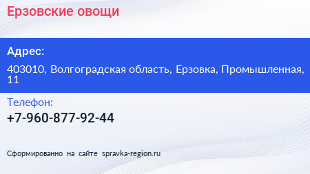 Ерзовские овощи по адресу 403010, Волгоградская область, Ерзовка, Промышленная, 11 в дальнейшем Организация, размещена в следующих категориях: