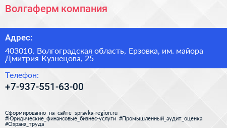 Волгаферм, компания по адресу 403010, Волгоградская область, Ерзовка, им. майора Дмитрия Кузнецова, 25 в дальнейшем Организация, размещена в следующих категориях: