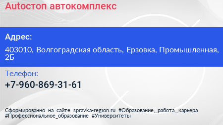 Autoстоп, автокомплекс по адресу 403010, Волгоградская область, Ерзовка, Промышленная, 2Б в дальнейшем Организация, размещена в следующих категориях: