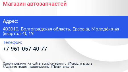 Магазин автозапчастей по адресу 403010, Волгоградская область, Ерзовка, Молодёжная (квартал 4), 19 в дальнейшем Организация, размещена в следующих категориях: