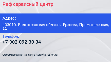 Реф, сервисный центр по адресу 403010, Волгоградская область, Ерзовка, Промышленная, 11 в дальнейшем Организация, размещена в следующих категориях: