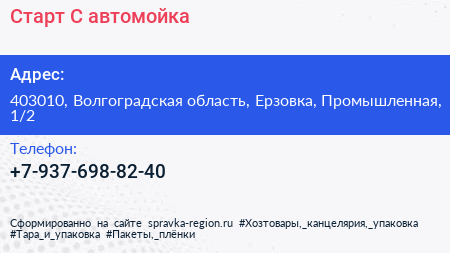 Старт-С, автомойка по адресу 403010, Волгоградская область, Ерзовка, Промышленная, 1/2 в дальнейшем Организация, размещена в следующих категориях: