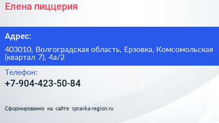 Елена, пиццерия по адресу 403010, Волгоградская область, Ерзовка, Комсомольская (квартал 7), 4а/2 в дальнейшем Организация, размещена в следующих категориях: