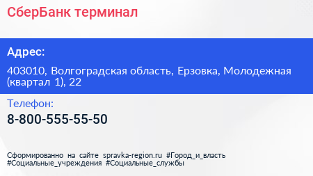 СберБанк, терминал по адресу 403010, Волгоградская область, Ерзовка, Молодежная (квартал 1), 22 в дальнейшем Организация, размещена в следующих категориях: