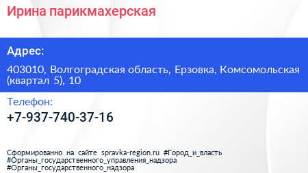 Ирина, парикмахерская по адресу 403010, Волгоградская область, Ерзовка, Комсомольская (квартал 5), 10 в дальнейшем Организация, размещена в следующих категориях: