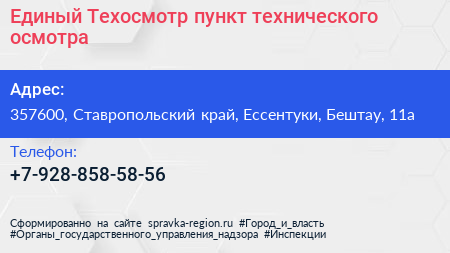 Единый Техосмотр, пункт технического осмотра по адресу 357600, Ставропольский край, Ессентуки, Бештау, 11а в дальнейшем Организация, размещена в следующих категориях: