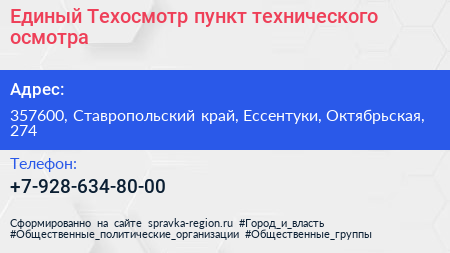 Единый Техосмотр, пункт технического осмотра по адресу 357600, Ставропольский край, Ессентуки, Октябрьская, 274 в дальнейшем Организация, размещена в следующих категориях: