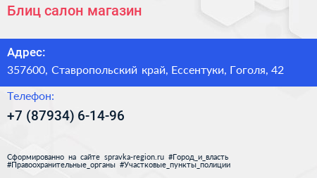 Блиц, салон-магазин по адресу 357600, Ставропольский край, Ессентуки, Гоголя, 42 в дальнейшем Организация, размещена в следующих категориях: