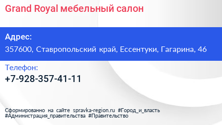 Grand Royal, мебельный салон по адресу 357600, Ставропольский край, Ессентуки, Гагарина, 46 в дальнейшем Организация, размещена в следующих категориях: