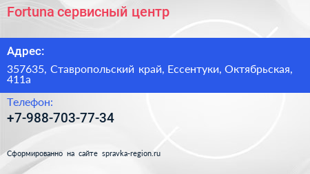Fortuna, сервисный центр по адресу 357635, Ставропольский край, Ессентуки, Октябрьская, 411а в дальнейшем Организация, размещена в следующих категориях: