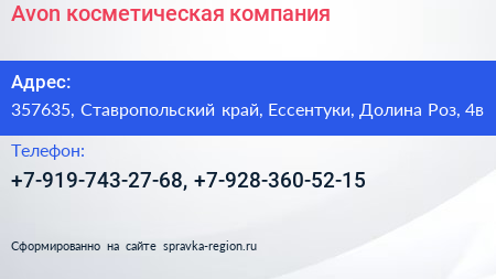 Avon, косметическая компания по адресу 357635, Ставропольский край, Ессентуки, Долина Роз, 4в в дальнейшем Организация, размещена в следующих категориях: