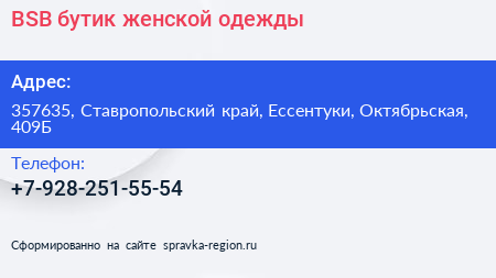 BSB, бутик женской одежды по адресу 357635, Ставропольский край, Ессентуки, Октябрьская, 409Б в дальнейшем Организация, размещена в следующих категориях: