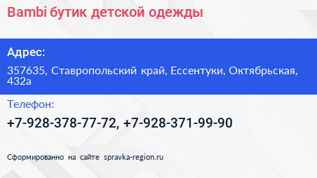 Bambi, бутик детской одежды по адресу 357635, Ставропольский край, Ессентуки, Октябрьская, 432а в дальнейшем Организация, размещена в следующих категориях: