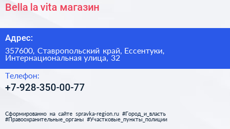 Bella la vita, магазин по адресу 357600, Ставропольский край, Ессентуки, Интернациональная улица, 32 в дальнейшем Организация, размещена в следующих категориях: