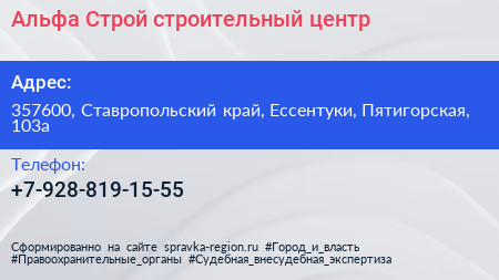 Альфа-Строй, строительный центр по адресу 357600, Ставропольский край, Ессентуки, Пятигорская, 103а в дальнейшем Организация, размещена в следующих категориях: