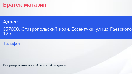 Братск, магазин по адресу 357600, Ставропольский край, Ессентуки, улица Гаевского, 195 в дальнейшем Организация, размещена в следующих категориях: