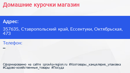 Домашние курочки, магазин по адресу 357635, Ставропольский край, Ессентуки, Октябрьская, 473 в дальнейшем Организация, размещена в следующих категориях:
