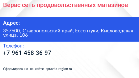 Верас, сеть продовольственных магазинов по адресу 357600, Ставропольский край, Ессентуки, Кисловодская улица, 106 в дальнейшем Организация, размещена в следующих категориях: