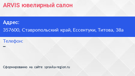 ARVIS, ювелирный салон по адресу 357600, Ставропольский край, Ессентуки, Титова, 38а в дальнейшем Организация, размещена в следующих категориях: