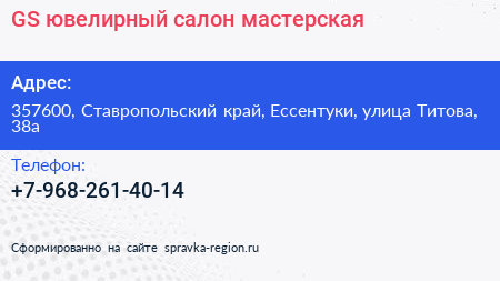 GS, ювелирный салон-мастерская по адресу 357600, Ставропольский край, Ессентуки, улица Титова, 38а в дальнейшем Организация, размещена в следующих категориях:
