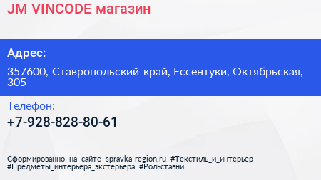JM VINCODE, магазин по адресу 357600, Ставропольский край, Ессентуки, Октябрьская, 305 в дальнейшем Организация, размещена в следующих категориях: