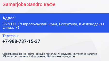 Gamarjoba|Sandro, кафе по адресу 357600, Ставропольский край, Ессентуки, Кисловодская улица, 71 в дальнейшем Организация, размещена в следующих категориях: