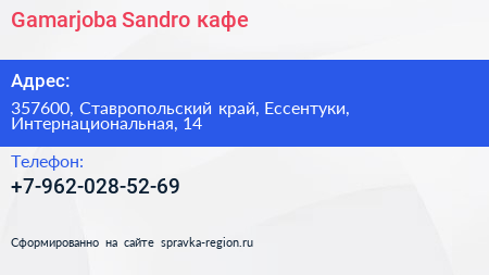 Gamarjoba|Sandro, кафе по адресу 357600, Ставропольский край, Ессентуки, Интернациональная, 14 в дальнейшем Организация, размещена в следующих категориях: