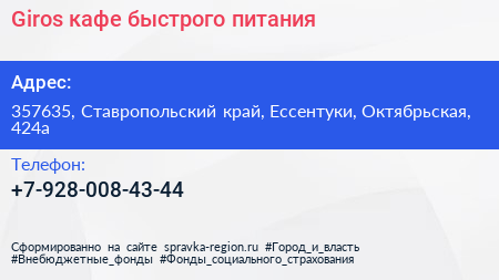 Giros, кафе быстрого питания по адресу 357635, Ставропольский край, Ессентуки, Октябрьская, 424а в дальнейшем Организация, размещена в следующих категориях: