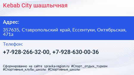 Kebab City, шашлычная по адресу 357635, Ставропольский край, Ессентуки, Октябрьская, 471а в дальнейшем Организация, размещена в следующих категориях: