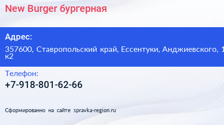 New Burger, бургерная по адресу 357600, Ставропольский край, Ессентуки, Анджиевского, 1 к2 в дальнейшем Организация, размещена в следующих категориях: