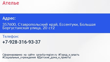 Ателье по адресу 357600, Ставропольский край, Ессентуки, Большая Боргустанская улица, 20 ст2 в дальнейшем Организация, размещена в следующих категориях: