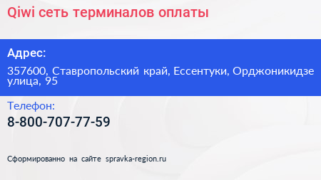 Qiwi, сеть терминалов оплаты по адресу 357600, Ставропольский край, Ессентуки, Орджоникидзе улица, 95 в дальнейшем Организация, размещена в следующих категориях: