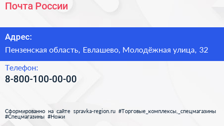 Почта России по адресу Пензенская область, Евлашево, Молодёжная улица, 32 в дальнейшем Организация, размещена в следующих категориях: