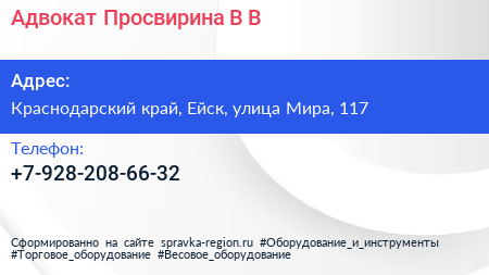 Адвокат Просвирина В.В. по адресу Краснодарский край, Ейск, улица Мира, 117 в дальнейшем Организация, размещена в следующих категориях: