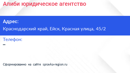 Алиби, юридическое агентство по адресу Краснодарский край, Ейск, Красная улица, 45/2 в дальнейшем Организация, размещена в следующих категориях: