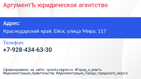 АргументЪ, юридическое агентство по адресу Краснодарский край, Ейск, улица Мира, 117 в дальнейшем Организация, размещена в следующих категориях: