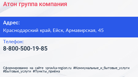 Атон, группа компания по адресу Краснодарский край, Ейск, Армавирская, 45 в дальнейшем Организация, размещена в следующих категориях: