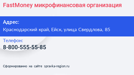 FastMoney, микрофинансовая организация по адресу Краснодарский край, Ейск, улица Свердлова, 85 в дальнейшем Организация, размещена в следующих категориях: