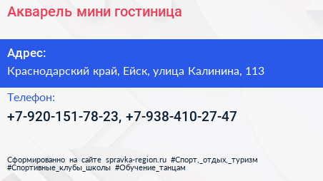 Акварель, мини-гостиница по адресу Краснодарский край, Ейск, улица Калинина, 113 в дальнейшем Организация, размещена в следующих категориях:
