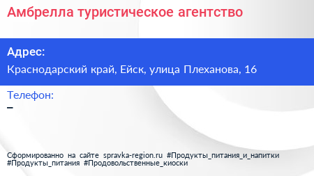 Амбрелла, туристическое агентство по адресу Краснодарский край, Ейск, улица Плеханова, 16 в дальнейшем Организация, размещена в следующих категориях: