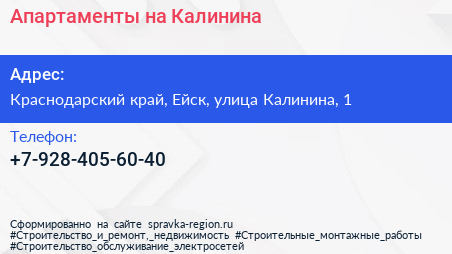 Апартаменты на Калинина по адресу Краснодарский край, Ейск, улица Калинина, 1 в дальнейшем Организация, размещена в следующих категориях: