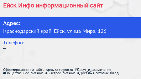 Ейск Инфо, информационный сайт по адресу Краснодарский край, Ейск, улица Мира, 126 в дальнейшем Организация, размещена в следующих категориях: