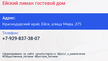 Ейский лиман, гостевой дом по адресу Краснодарский край, Ейск, улица Мира, 275 в дальнейшем Организация, размещена в следующих категориях: