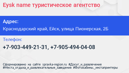 Eysk.name, туристическое агентство по адресу Краснодарский край, Ейск, улица Пионерская, 2Б в дальнейшем Организация, размещена в следующих категориях: