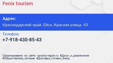 Fenix tourism по адресу Краснодарский край, Ейск, Красная улица, 43 в дальнейшем Организация, размещена в следующих категориях: