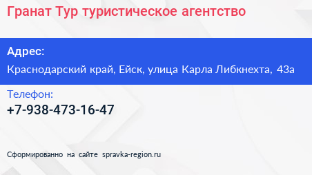 Гранат Тур, туристическое агентство по адресу Краснодарский край, Ейск, улица Карла Либкнехта, 43а в дальнейшем Организация, размещена в следующих категориях: