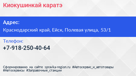 Киокушинкай каратэ по адресу Краснодарский край, Ейск, Полевая улица, 53/1 в дальнейшем Организация, размещена в следующих категориях: