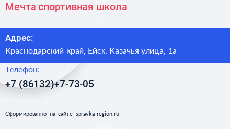 Мечта, спортивная школа по адресу Краснодарский край, Ейск, Казачья улица, 1а в дальнейшем Организация, размещена в следующих категориях:
