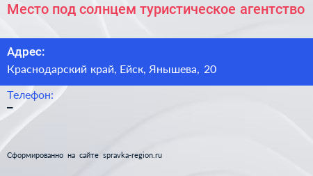 Место под солнцем, туристическое агентство по адресу Краснодарский край, Ейск, Янышева, 20 в дальнейшем Организация, размещена в следующих категориях: